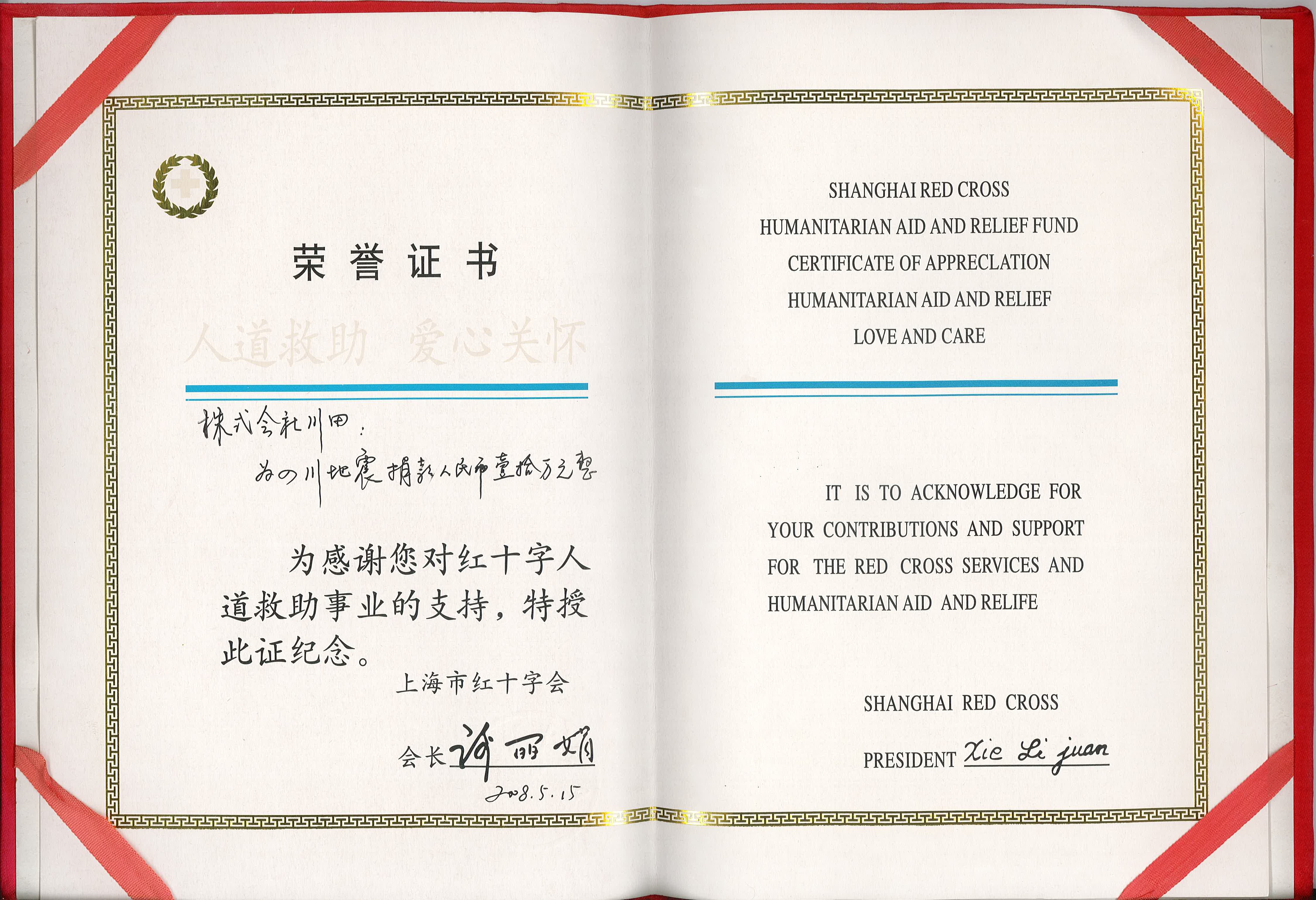 2008年度上海市赤十字栄譽(yù)証書-川田上海